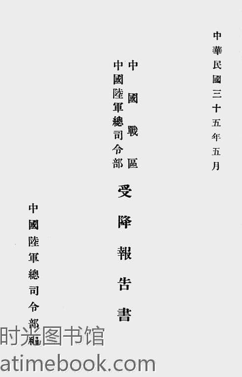 | 网盘路径:/时光图书馆珍藏系列/书籍文件/老图书/《中国战区中国陆军总司令部受降报告书》电子版合集.db | ||