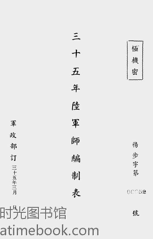 | 网盘路径:/时光图书馆珍藏系列/书籍文件/老图书/《三十五年陆.军.师.编.制.表》电子版合集.db | ||