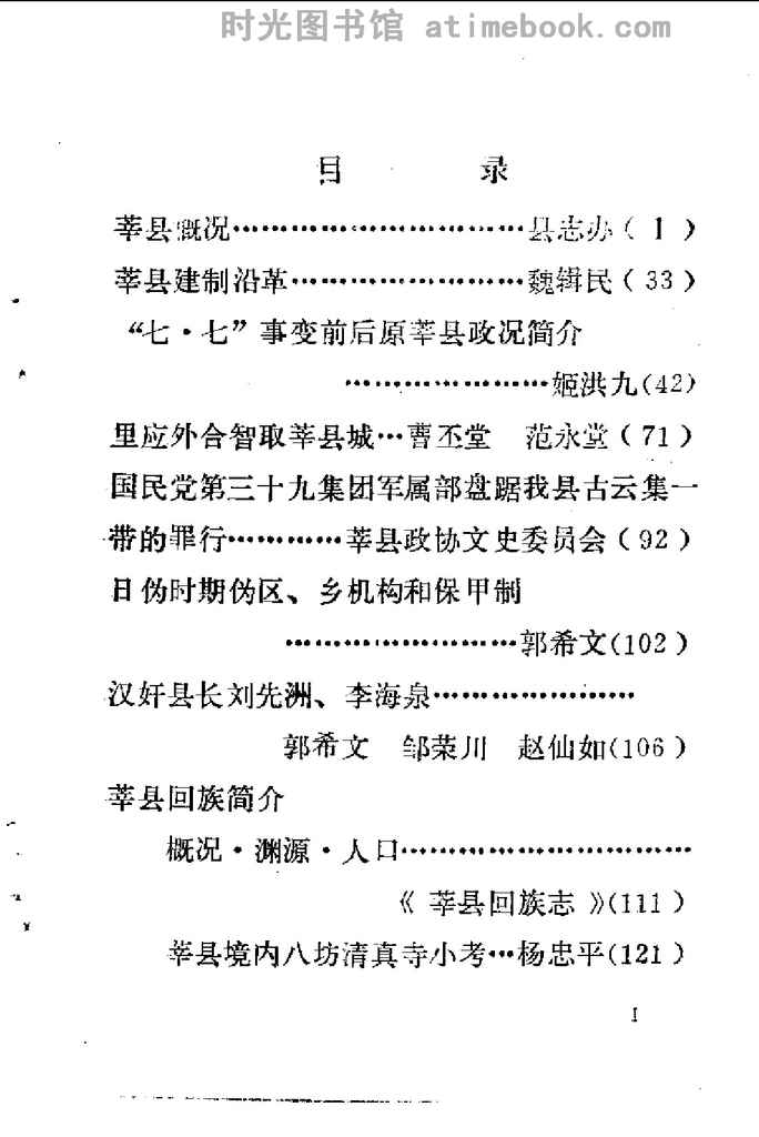 | 网盘路径:/时光图书馆珍藏系列/书籍文件/老图书/《莘县文史资料_第1辑》电子版合集.db | ||