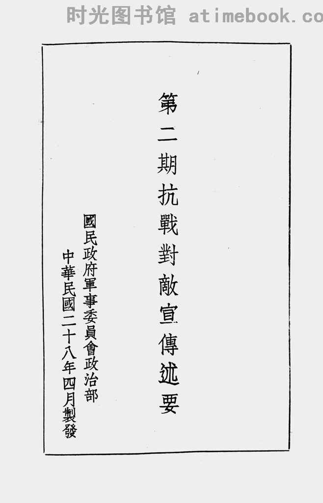 | 网盘路径:/时光图书馆珍藏系列/书籍文件/老图书/《第二期抗战对敌宣传述要》电子版合集.db | ||
