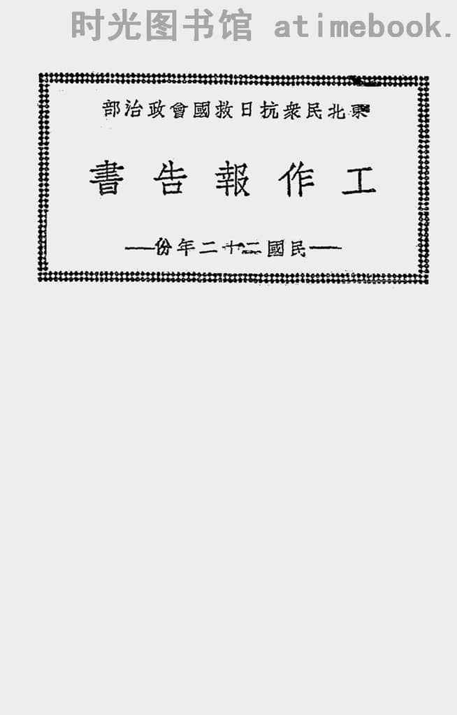 | 网盘路径:/时光图书馆珍藏系列/书籍文件/老图书/《东北民众抗日救国会政治部民国二十二年份工作报告书》电子版合集.db | ||