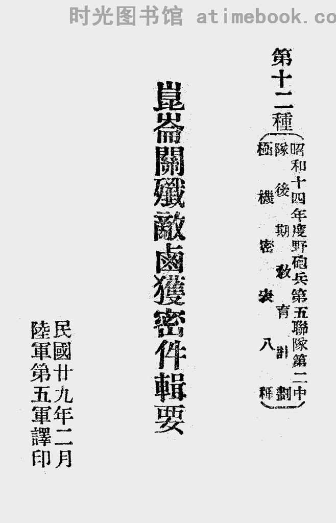 | 网盘路径:/时光图书馆珍藏系列/书籍文件/老图书/《昆仑关歼敌卤获密件辑要第十二种》电子版合集.db | ||