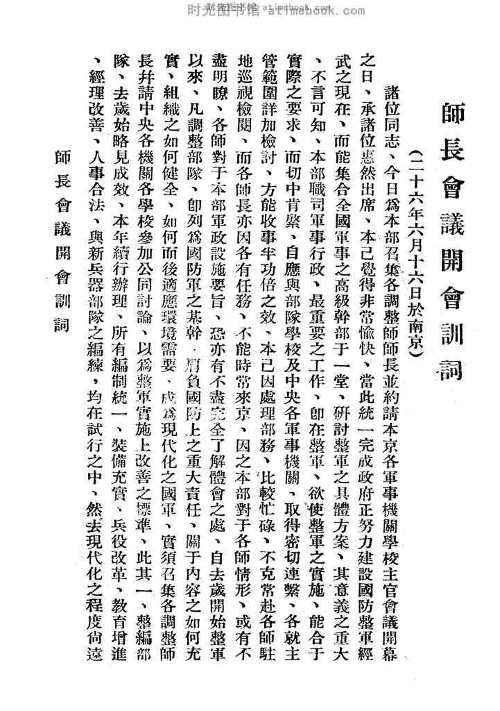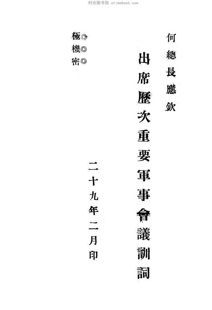 | 网盘路径:/时光图书馆珍藏系列/书籍文件/老图书/《何总长应钦出席歴次重要军事会议训词》电子版合集.db | ||