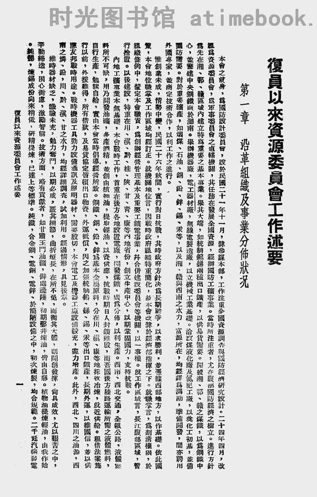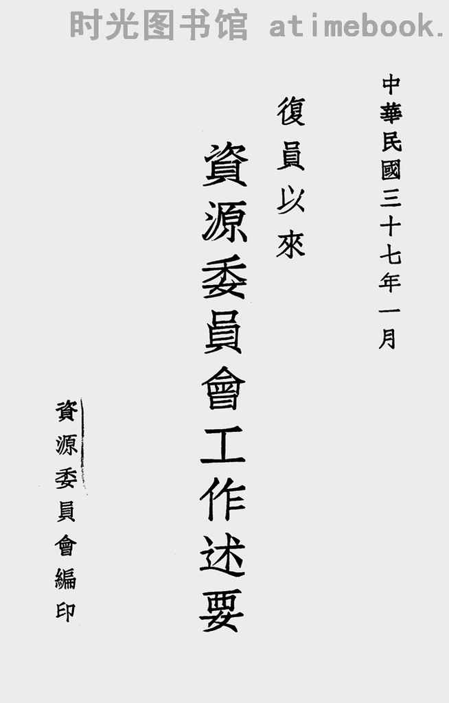 | 网盘路径:/时光图书馆珍藏系列/书籍文件/老图书/《复员以来资源委员会工作述要(中华民国三十七年一月)》电子版合集.db | ||