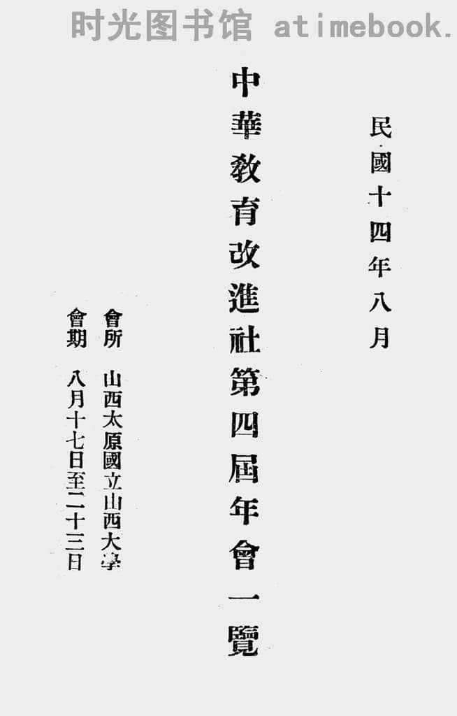 | 网盘路径:/时光图书馆珍藏系列/书籍文件/老图书/《中华教育改进社第四届年会一览》电子版合集.db | ||