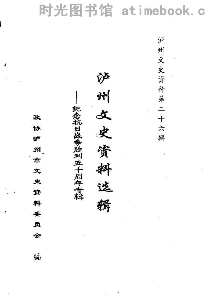 | 网盘路径:/时光图书馆珍藏系列/书籍文件/老图书/《泸州文史资料_第26辑_泸州文史资料选辑——纪念抗日战争胜利50周年专辑》电子版合集.db | ||