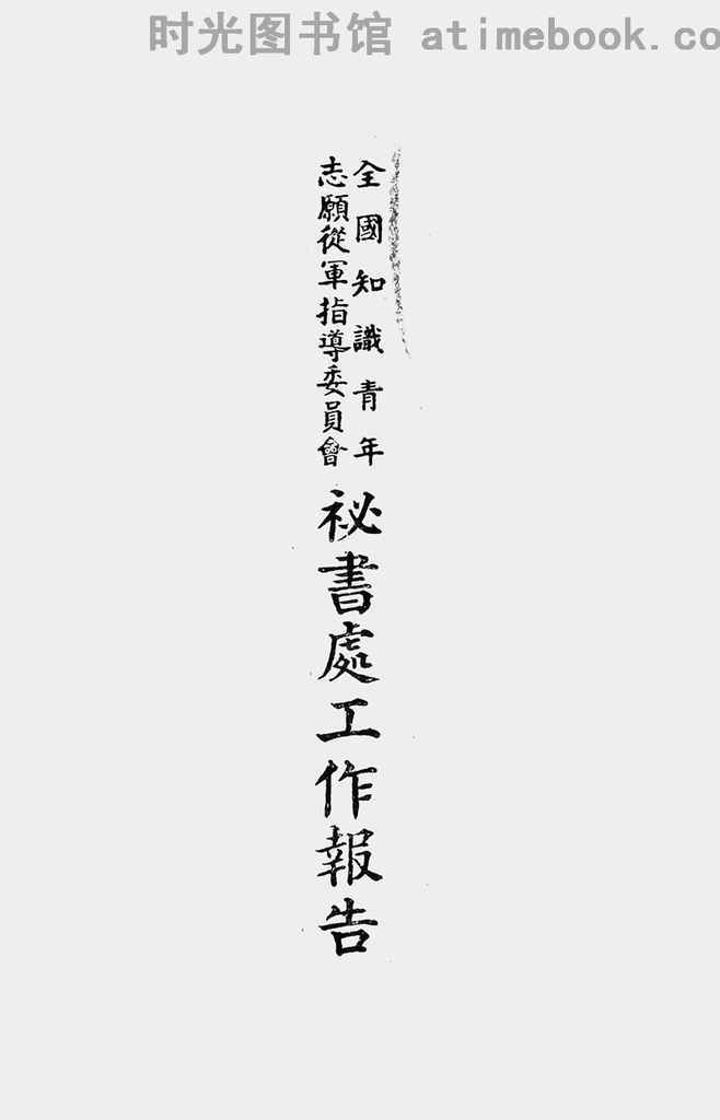 | 网盘路径:/时光图书馆珍藏系列/书籍文件/老图书/《全国知识青年志愿从军指导委员会秘书处工作报告》电子版合集.db | ||