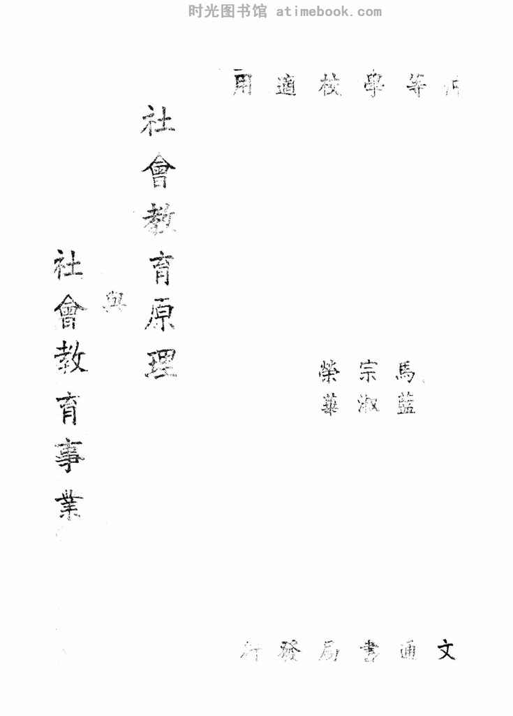 | 网盘路径:/时光图书馆珍藏系列/书籍文件/老图书/《社会教育原理与社会教育事业》电子版合集.db | ||