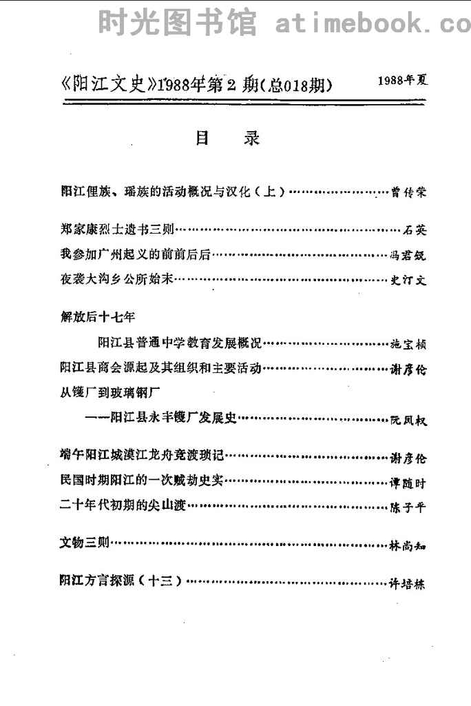 | 网盘路径:/时光图书馆珍藏系列/书籍文件/老图书/《阳江文史_1988第2期_总018期》电子版合集.db | ||