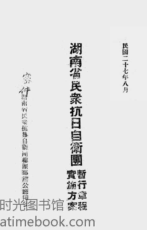 | 网盘路径:/时光图书馆珍藏系列/书籍文件/老图书/《湖南省民众抗日自卫团暂行章程、实施方案》电子版合集.db | ||
