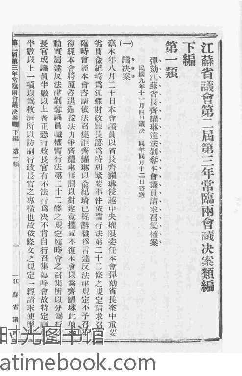 | 网盘路径:/时光图书馆珍藏系列/书籍文件/老图书/《江苏省议会第二届第三年常临两会议决案类编_下编_附编》电子版合集.db | ||