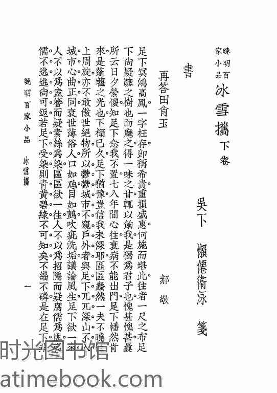 | 网盘路径:/时光图书馆珍藏系列/书籍文件/老图书/《晚明百家小品_冰雪携_下册》电子版合集.db | ||