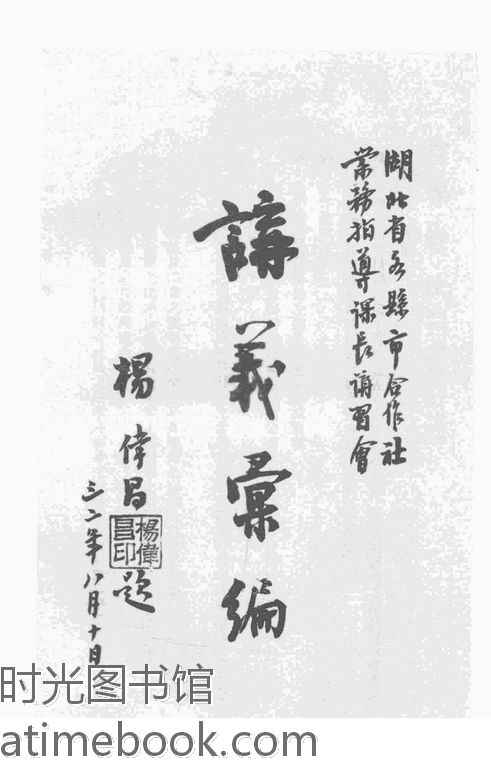| 网盘路径:/时光图书馆珍藏系列/书籍文件/老图书/《湖北省各县市合作社常务指导课长讲习会讲义汇编》电子版合集.db | ||