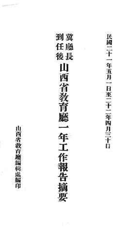 | 网盘路径:/时光图书馆珍藏系列/书籍文件/老图书/《冀厅长到任后山西省教育厅一年之工作报告摘要》电子版合集.db | ||
