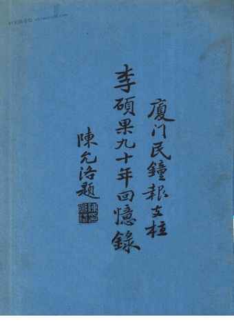 | 网盘路径:/时光图书馆珍藏系列/书籍文件/老图书/《厦门民钟报支柱——李硕果九十年回忆录》电子版合集.db | ||