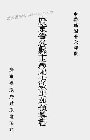 | 网盘路径:/时光图书馆珍藏系列/书籍文件/老图书/《广东省各县市局地方款追加预算书(中华民国廿六年度)》电子版合集.db | ||