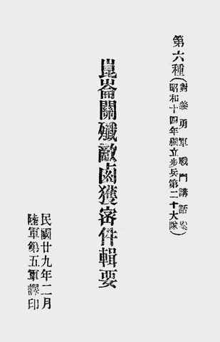 | 网盘路径:/时光图书馆珍藏系列/书籍文件/老图书/《昆仑关歼敌卤获密件辑要第六种》电子版合集.db | ||