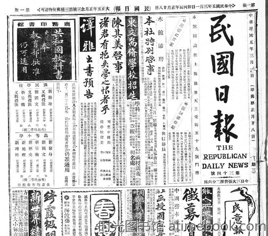 1924年中国国民*第一次全国代表大会后,成为中国国民*的机关报。1926年秋与1927年初,曾短期停刊又马上复刊。1932年“一二八事变”前夕,在日本侵略势力逼迫下,上海公共租界工部局于1月26日通告该报停刊。同年5月4日,改以《民报》名义出版。1937年上海沦陷后,《民报》于11月24日停刊。1945年抗战胜利后,该报改回《民国日报》本名,于同年10月6日在沪复刊,接1932年1月上海发行号数,续出版第5666号,至1947年1月31日终刊。
