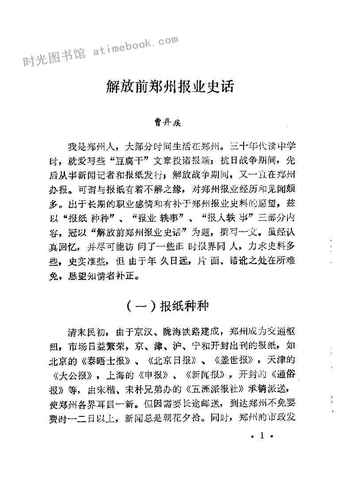 | 网盘路径:/时光图书馆珍藏系列/书籍文件/老图书/《郑州文史资料_第9辑_解放前郑州报业史料专辑》电子版合集.db | ||