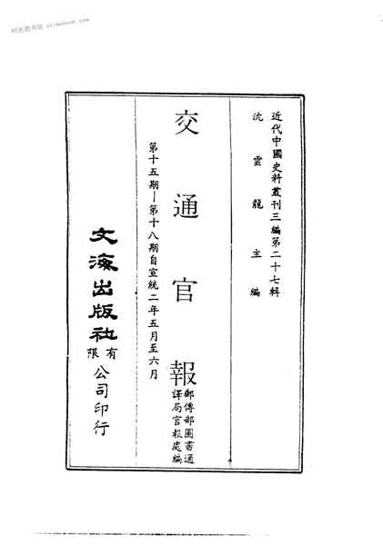 | 网盘路径:/时光图书馆珍藏系列/书籍文件/老图书/《交通官报(第十五-十八期自宣統二年五-六月)》电子版合集.db | ||