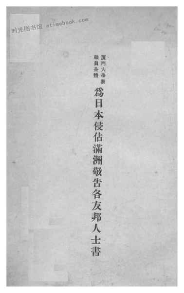 | 网盘路径:/时光图书馆珍藏系列/书籍文件/老图书/《厦门大学教职员全体为日本侵占满洲敬告各友邦人士书》电子版合集.db | ||