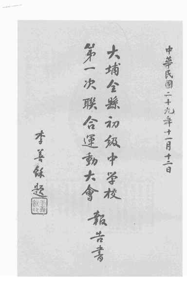 | 关键词:大埔县,初级中学,第一次联合运动会,报告书, | ||