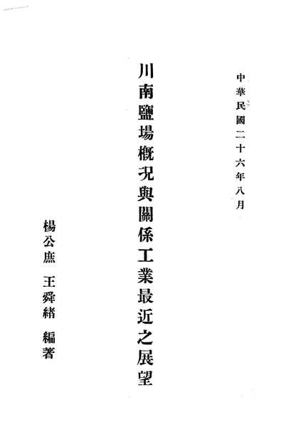 | 网盘路径:/时光图书馆珍藏系列/书籍文件/老图书/《川南盐场概况与关系工业最近之展望》电子版合集.db | ||