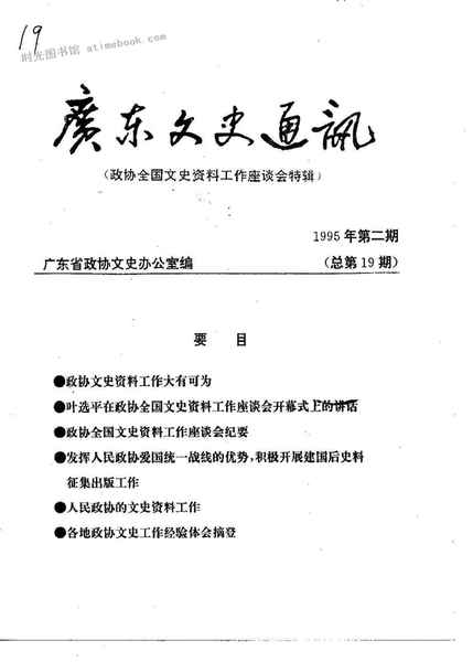 | 网盘路径:/时光图书馆珍藏系列/书籍文件/老图书/《广东文史通讯_总第19期》电子版合集.db | ||