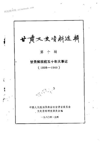 | 网盘路径:/时光图书馆珍藏系列/书籍文件/老图书/《甘肃文史资料选辑_第10辑_(甘肃解放前五十年大事记_1898-1949)》电子版合集.db | ||