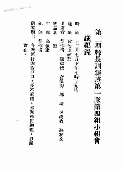 | 网盘路径:/时光图书馆珍藏系列/书籍文件/老图书/《第二期县长训练班第一队事务技术研究纪录》电子版合集.db | ||
