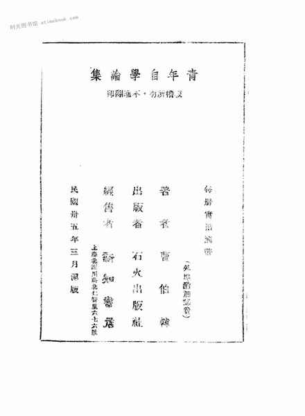 | 网盘路径:/时光图书馆珍藏系列/书籍文件/老图书/《青年自学论集》电子版合集.db | ||