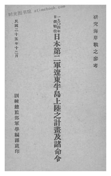 | 网盘路径:/时光图书馆珍藏系列/书籍文件/老图书/《1904年日俄战役日本第二军辽东半岛上陆之计划及诸命令》电子版合集.db | ||