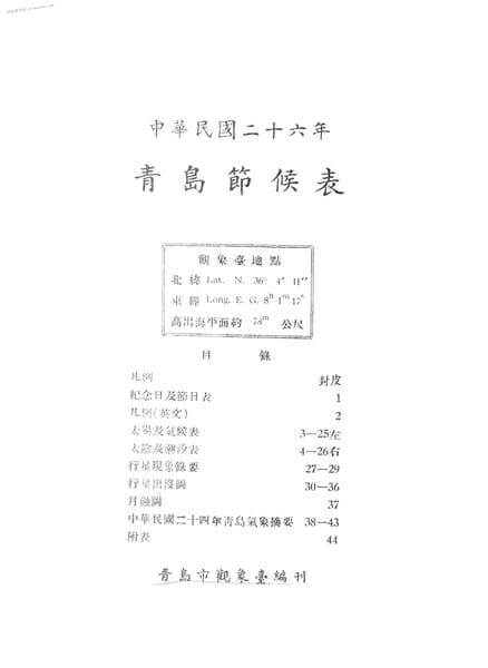 | 网盘路径:/时光图书馆珍藏系列/书籍文件/老图书/《中华民国二十六年青岛节候表》电子版合集.db | ||