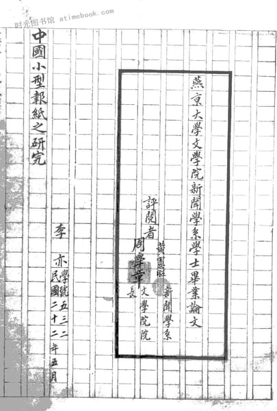 | 网盘路径:/时光图书馆珍藏系列/书籍文件/老图书/《中国小型报纸之研究》电子版合集.db | ||