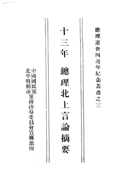 | 网盘路径:/时光图书馆珍藏系列/书籍文件/老图书/《十三年_总理北上言论摘要》电子版合集.db | ||