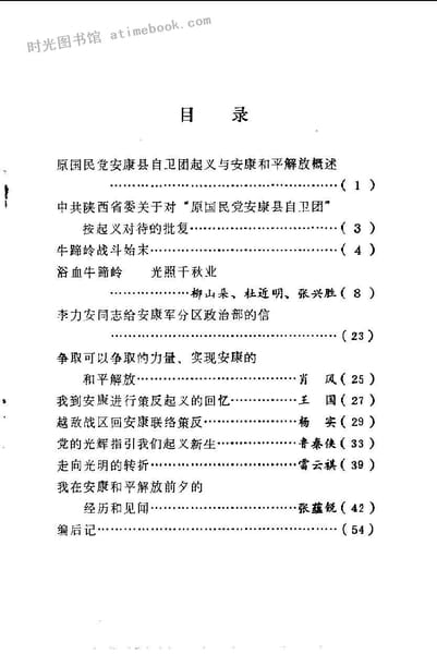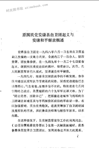 | 网盘路径:/时光图书馆珍藏系列/书籍文件/老图书/《安康县文史资料选辑_第1辑_安康和平解放》电子版合集.db | ||