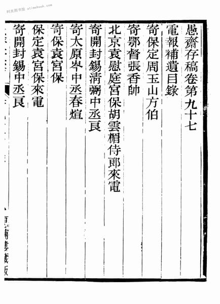 | 关键词:盛宣怀,愚斋存稿,初刊,电报补遗目录, | ||