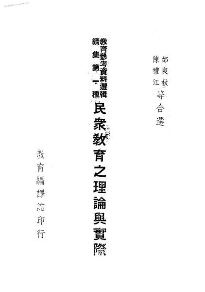 | 网盘路径:/时光图书馆珍藏系列/书籍文件/老图书/《教育参考资料选辑续集第一种:民众教育之理论与实际》电子版合集.db | ||