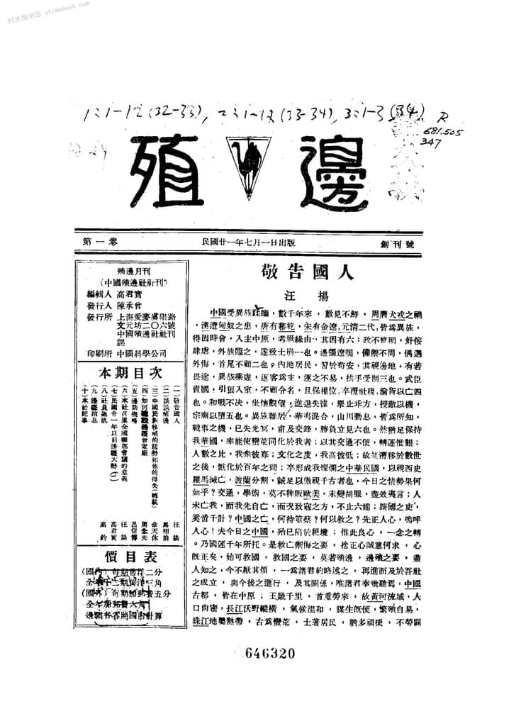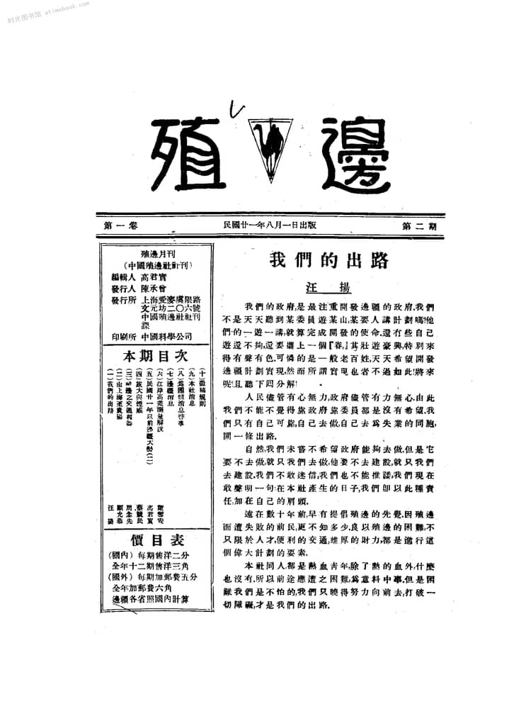 网盘路径:/时光图书馆珍藏系列/书籍文件/老杂志、老期刊/民国期刊/上海/《殖边》(上海)1932-1935年合集.db
