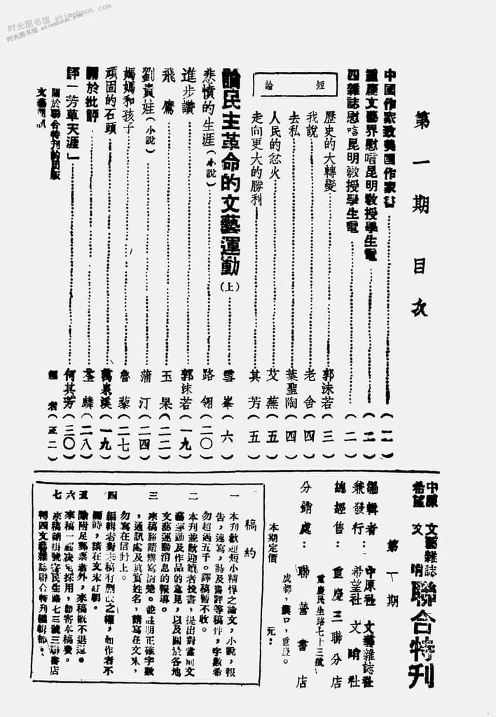 网盘路径:/时光图书馆珍藏系列/书籍文件/老杂志、老期刊/民国期刊/四川/《中原·文艺杂志·希望·文哨联合特刊》(重庆)1946-1946年合集.db