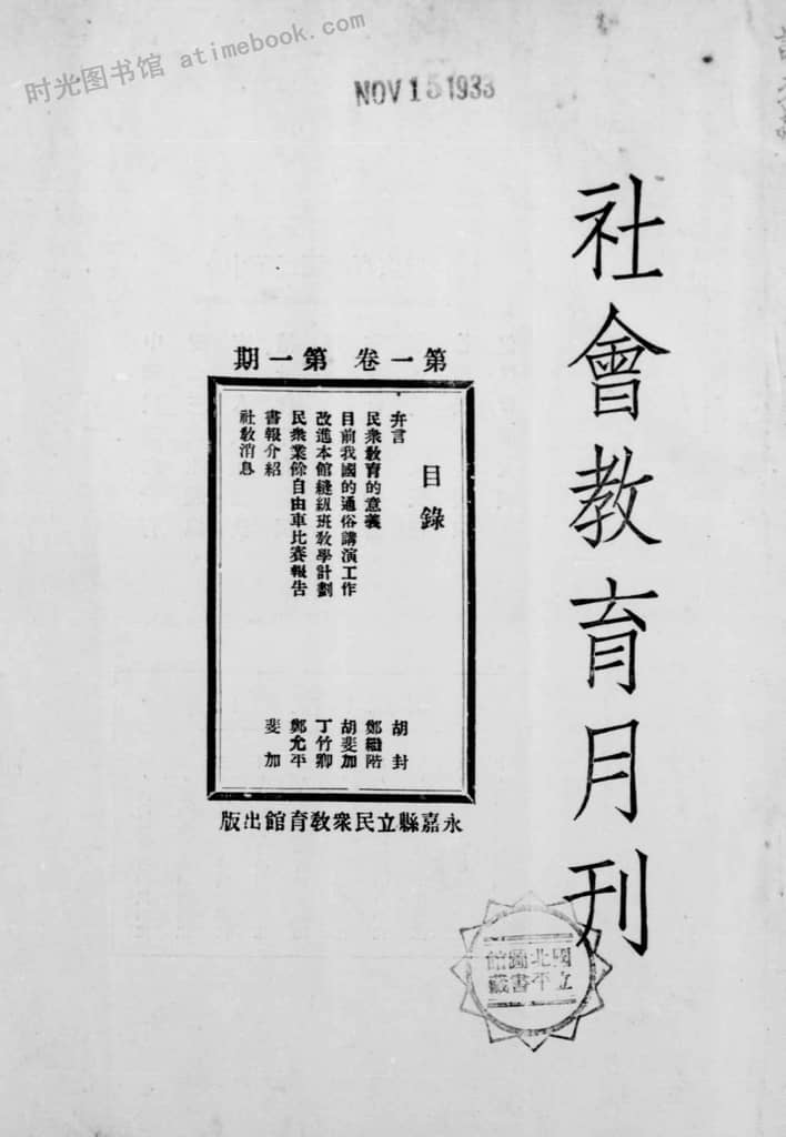 书籍名称:《社会教育月刊》(浙江永嘉县)1933-1936年合集