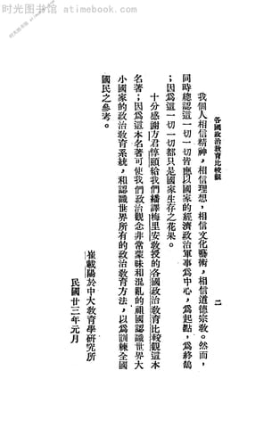 | 网盘路径:/时光图书馆珍藏系列/书籍文件/老图书/《国立中山大学教育学研究所丛书之27_各国政治教育比较观》电子版合集.db | ||