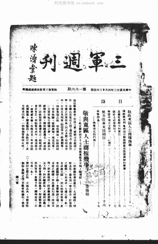 网盘路径:/时光图书馆珍藏系列/书籍文件/老杂志、老期刊/民国期刊/广东/《三军周刊》(广州)1934-1934年合集.db