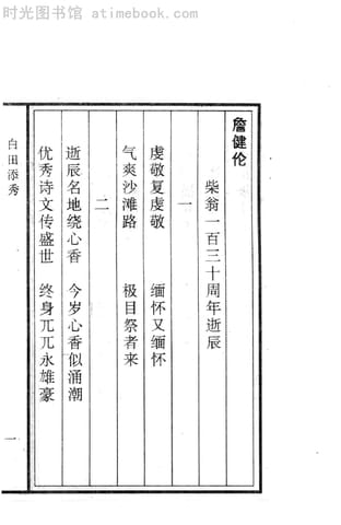 | 网盘路径:/时光图书馆珍藏系列/书籍文件/老图书/《白田添秀_纪念郑子尹先生逝世130周年》电子版合集.db | ||