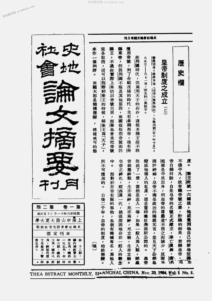 书籍名称:《史地社会论文摘要月刊》(上海)1934-1937年合集
