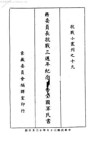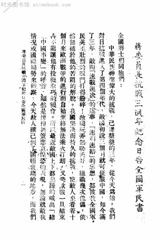 | 网盘路径:/时光图书馆珍藏系列/书籍文件/老图书/《蒋委员长抗战三周年纪念日告全国军民书》电子版合集.db | ||