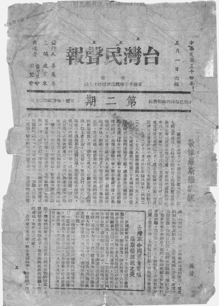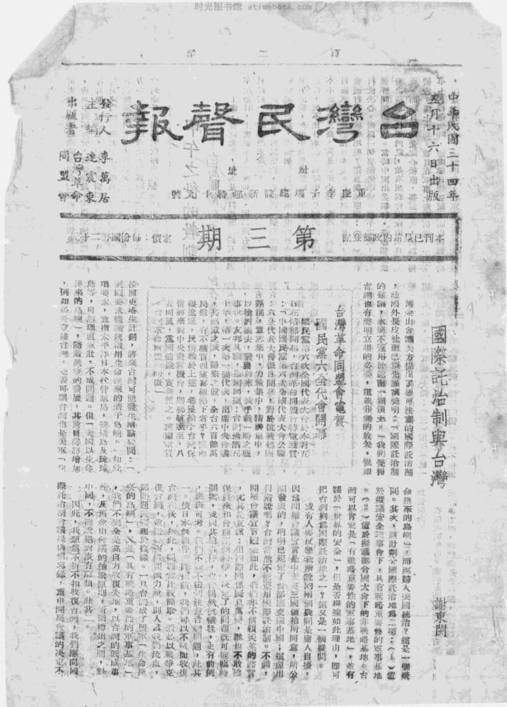 书籍名称:《台湾民声报》(重庆)1945-1945年合集