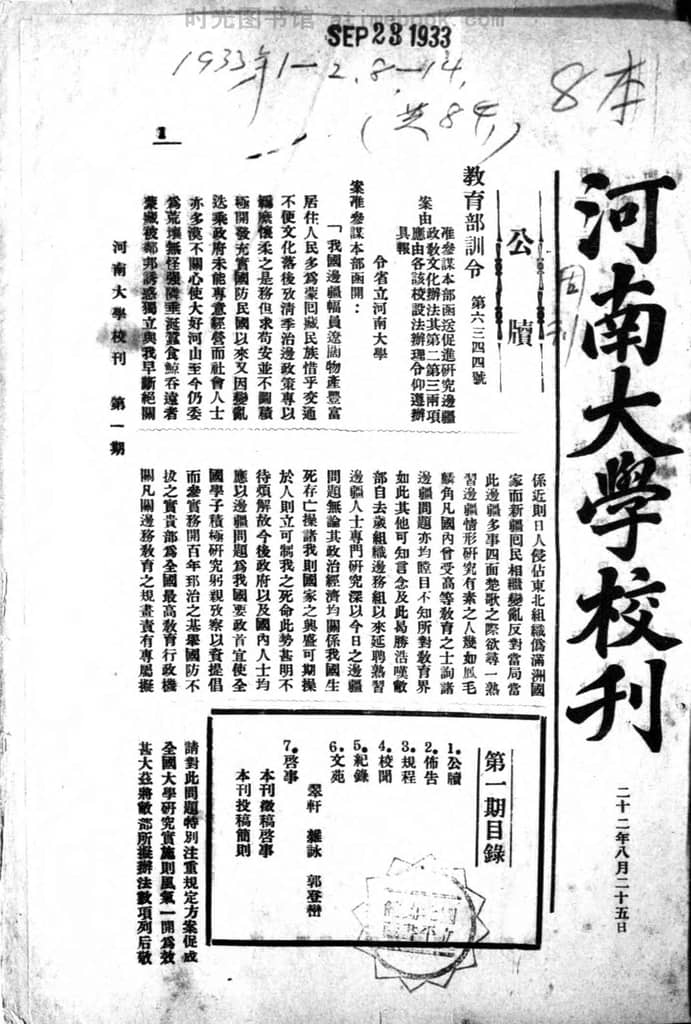 书籍名称:《河南大学校刊》(开封)1933-1933年合集