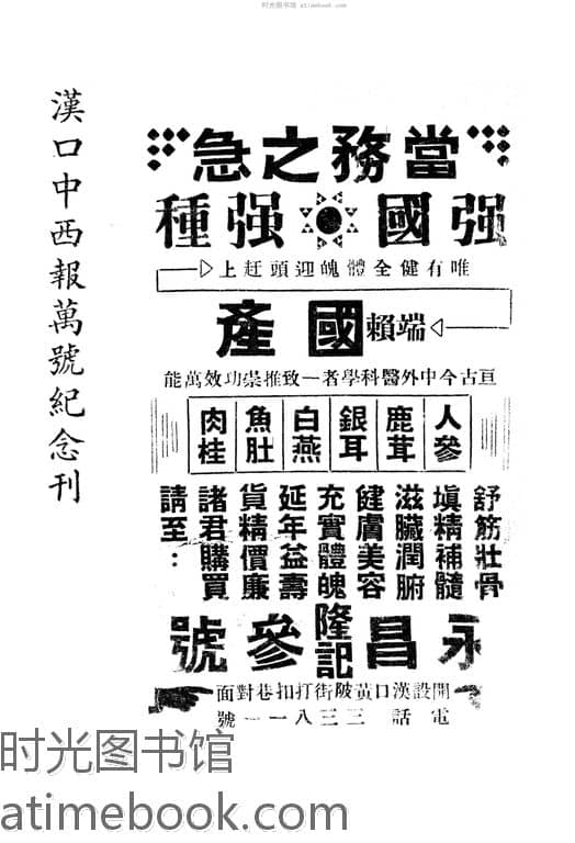 | 网盘路径:/时光图书馆珍藏系列/书籍文件/老图书/《汉口中西报万号纪念刊》电子版合集.db | ||